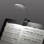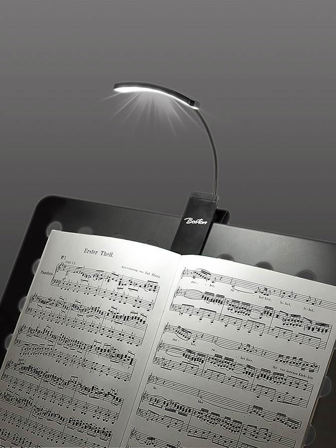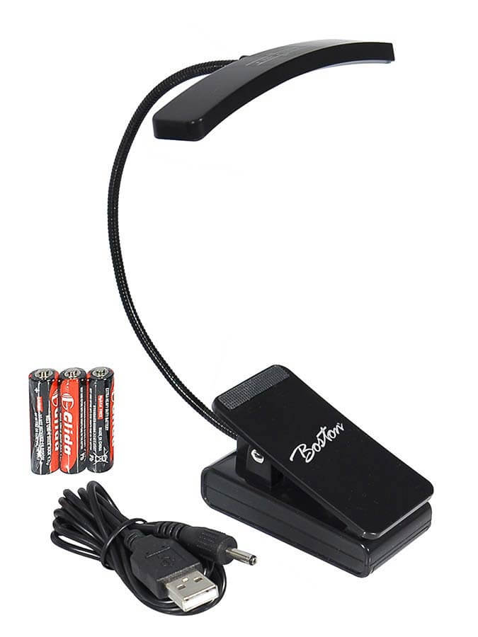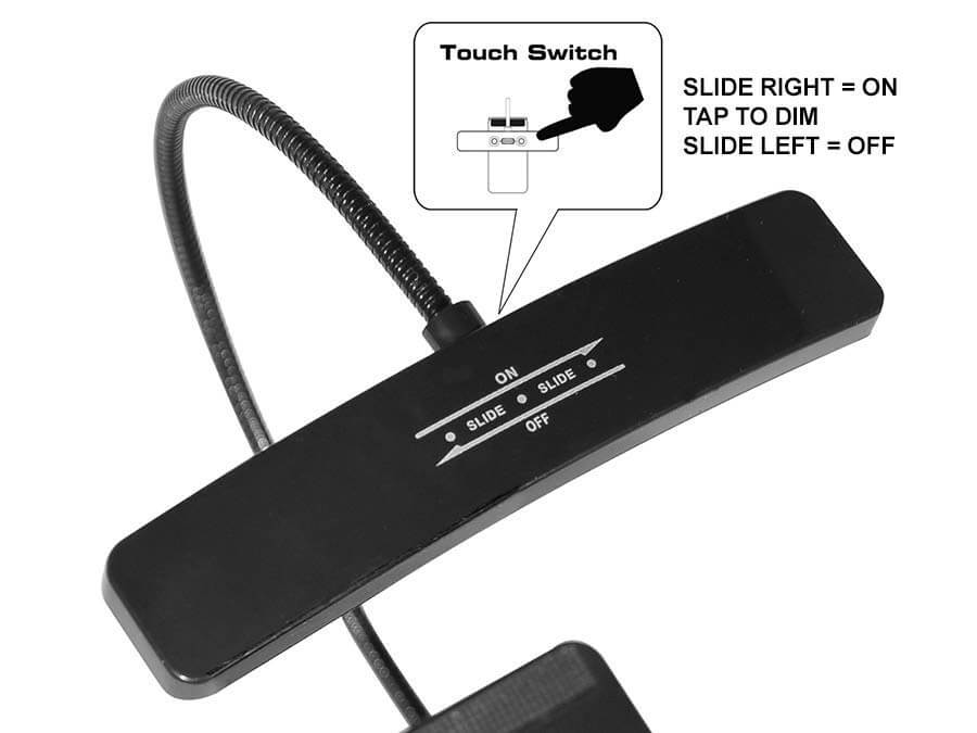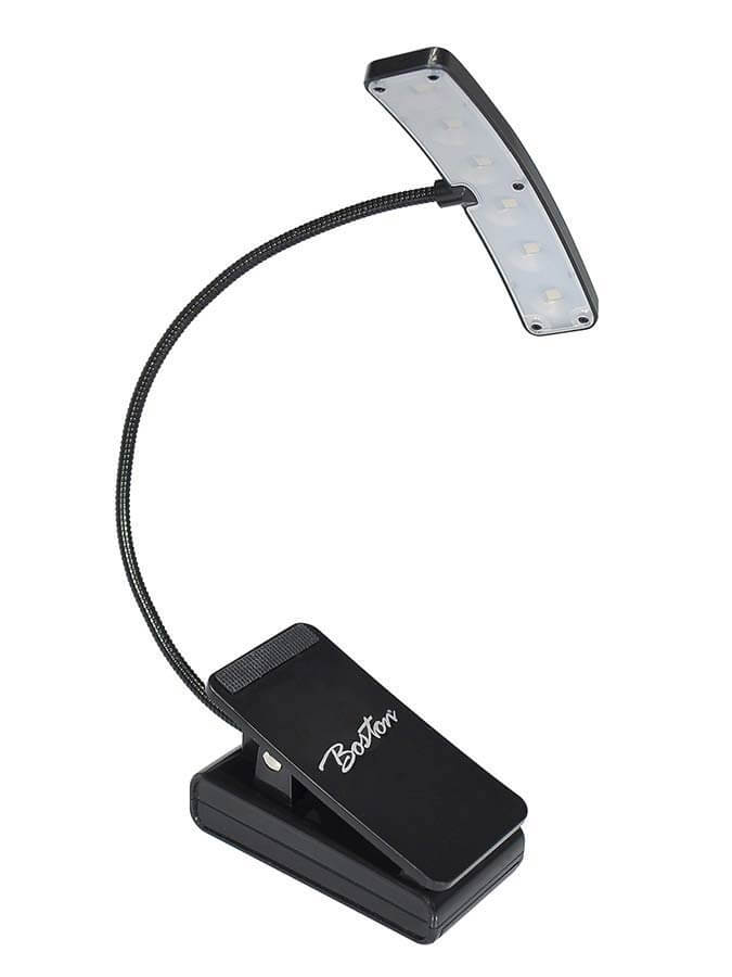 Deze Boston lessenaarlamp geeft helder licht, is lekker compact en heeft een onzichtbare aan/uit knop. Je kunt van links naar rechts swipen om de lamp aan te zetten, erop tappen om de lichtopbrengst te reguleren (3 standen) en van rechts naar links swipen om hem weer uit te schakelen. Je klemt hem met gemak aan je muziekstandaard vast en dmv de zwanenhals is de hoek in de gewenste stand in te stellen.