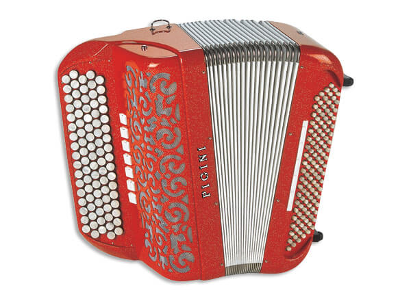 Rechterhand 5 rijen, 87 knoppen, 52 tonen 3 korig, cassotto (1), 7 registers