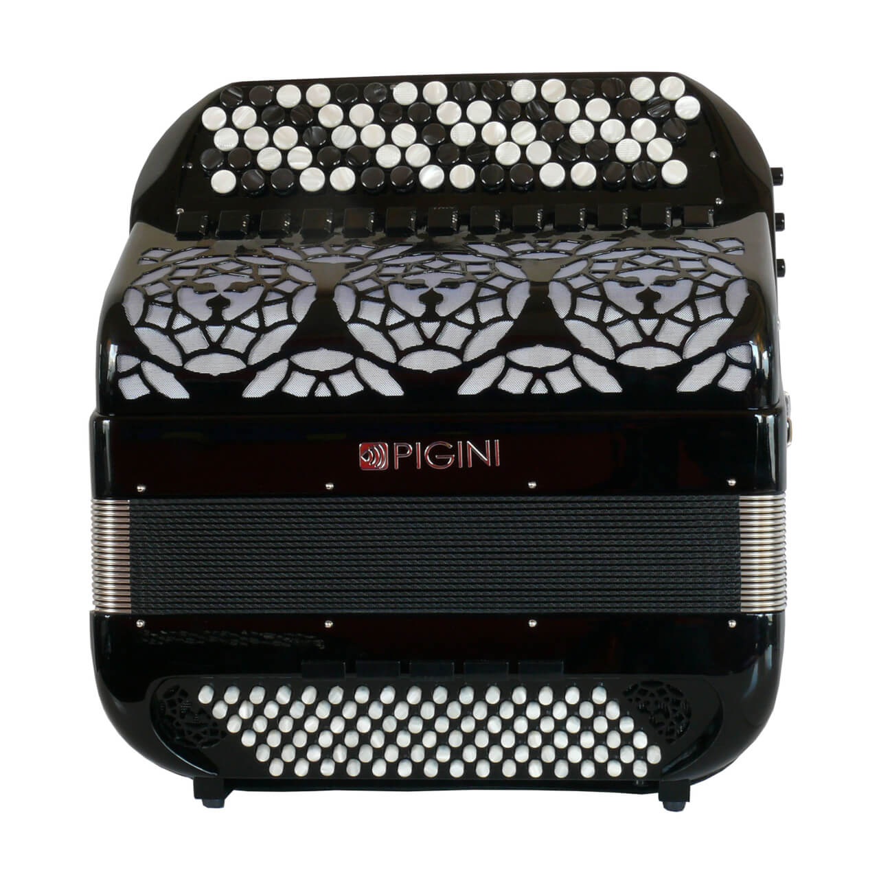 Rechterhand 5 rijen, 82 knoppen, 49 tonen 4 korig (16+16+8+8 of 16+8+8+4) cassotto (2), 13 registers 3 kinregisters